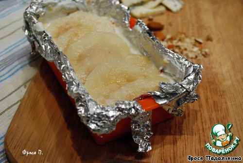 Выложить ломтики груш слегка внахлест, покрыть оставшимся творогом, посыпать орехами, завершить десерт сырными полосками. Охлаждать 4-5 часов. Перед подачей вынуть, опрокинув форму, нарезать пластинками.
