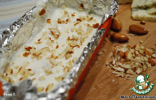 сверху 2 ст.л. творога, посыпать половиной орехов