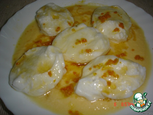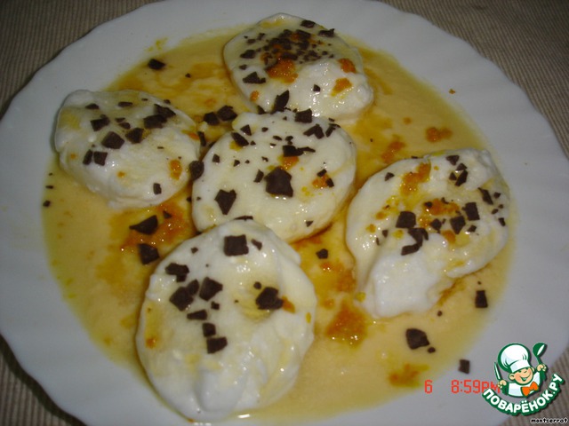 В широкую кастрюлю налить воды, капнуть лимонного сока, нагреть (не кипятить), в горячую воду опускаем ложку взбитых белков, прогреваем 1 минуту, переворачиваем белковый шар, прогреваем еще минуту. Белок заваривается и становится плотный. Вынимаем на тарелку, даем стечь воде.
