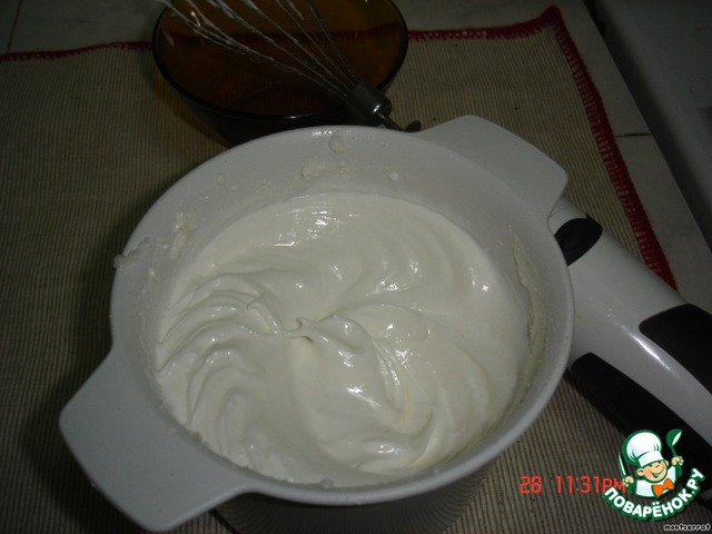 Белки отделить от желтков, взбить в крепкую пену. В конце постепенно добавлять 1/2 сахарa, ложку лимонного сока, продолжая взбивать. Получаем плотную блестящую массу.