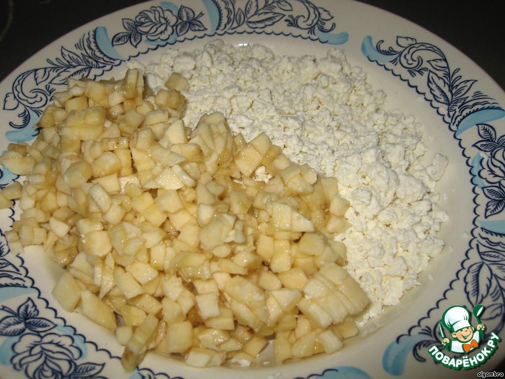 Творог разминаем вилкой и добавляем к нему нарезанные бананы.