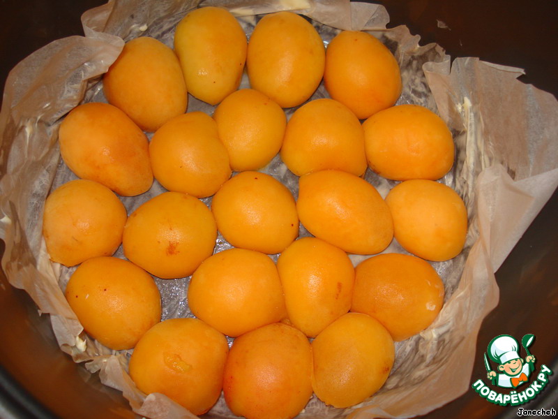 Смажьте сливочным маслом форму и бумагу для выпечки. Абрикосы вымойте, обсушите, разделите их на половинки и выньте косточки. Выложите концентрическими кругами их в форму.