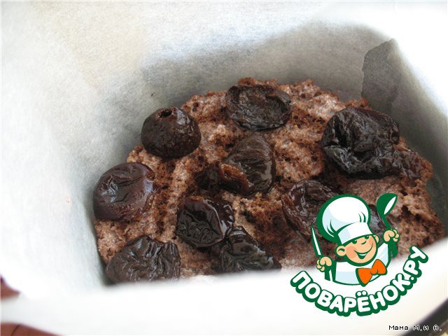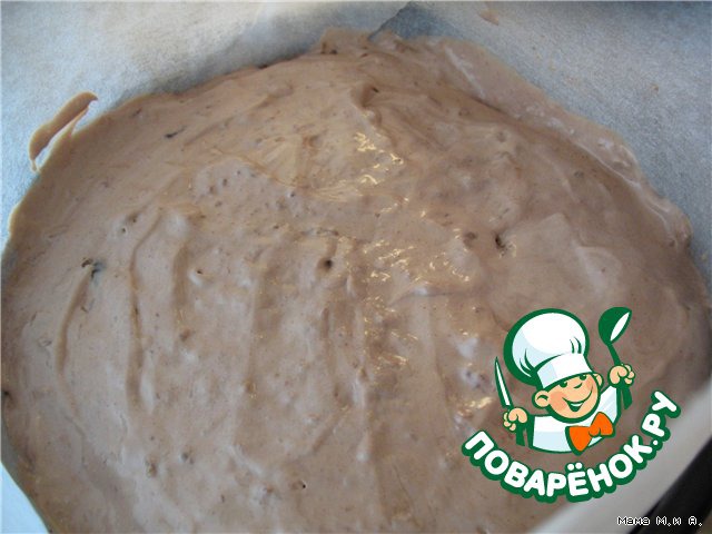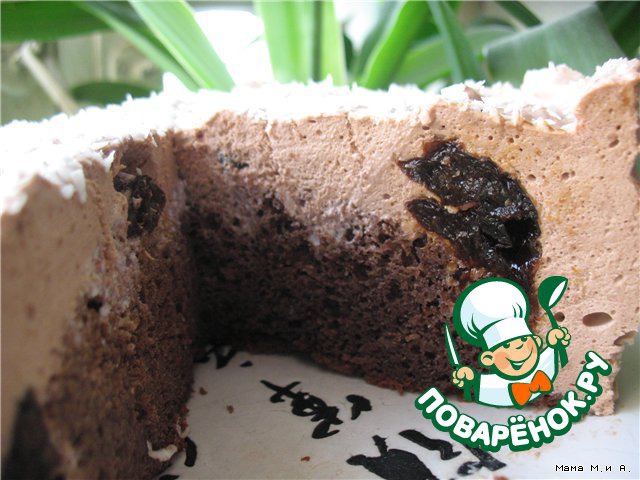 Выложить в разъемную форму 1 испеченный бисквитный корж, сверху можно положить замоченный предварительно в бренди чернослив (это моя личная инициатива)