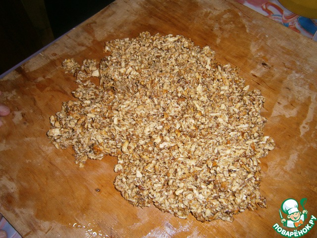 Затем взять деревянную доску, смочить ее водой и выложить ореховую массу.