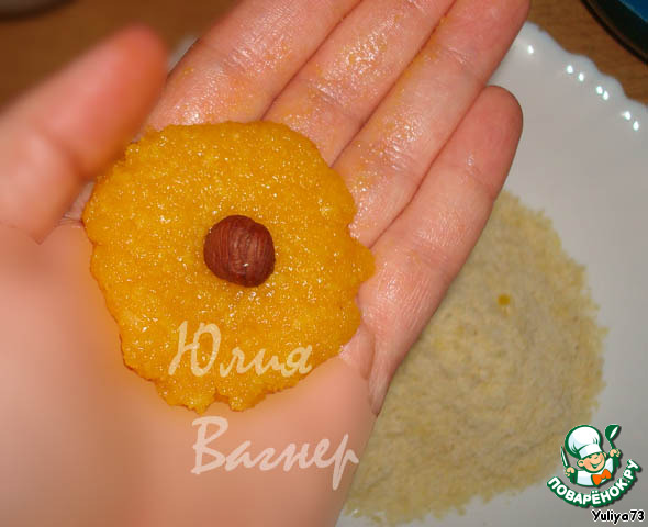 Смешивам все ингредиенты, я добавила еще 2 желтка, но они НЕ ОБЯЗАТЕЛЬНЫ, просто хотелось сделать желтого цвета массу. Делаем лепешечку и кладем фундук, затем скатываем небольшой шарик.