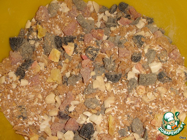Вылить яично-масляную смесь в смесь хлопьев с сухофруктами, добавить разрыхлитель и корицу и вымешать.