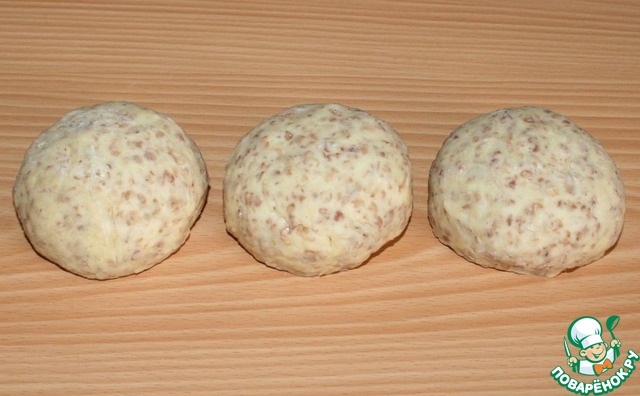 Затем добавить гречневые хлопья и муку, смешанную с разрыхлителем теста.