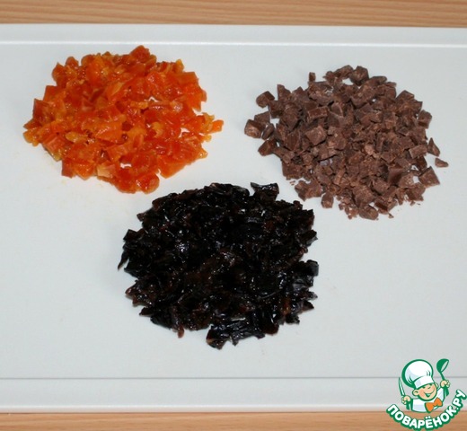 Курагу и чернослив промыть, залить горячей водой, оставить на 15-20 минут, слить воду. Курагу, чернослив и шоколад мелко нарезать.