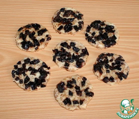 Далее раскатать второй пласт теста, выложить чернослив, вдавить в тесто, вырезать кружки с помощью формы или стакана.