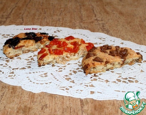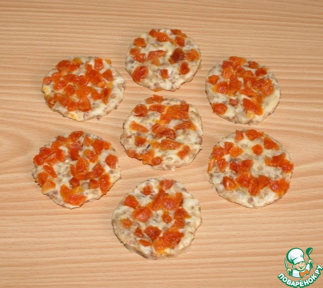 И так же раскатать третью часть теста, выложить курагу, вдавить в тесто и вырезать кружки.