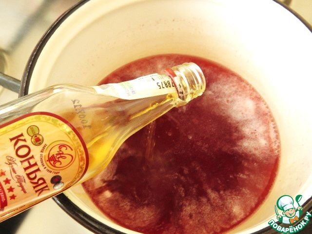 Пока тортики выпекаются приготовим соус. Берём любое варенье (у меня малиновое), добавляем 100г воды, коньяк и доводим до кипения.