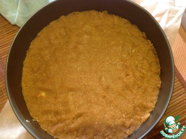 Растопить масло в микроволновке и смешать с печеньем. В форму для торта выложить печенье и разровнять ровным слоем, плотно прижимая по всей площади. Убрать в холодильник пока готовиться заливка.