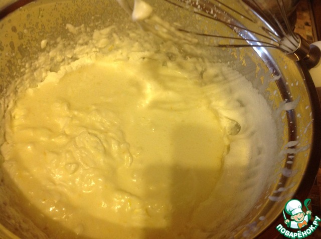 Взбиваем сливки до твердых пиков и к ним добавляем творожной-лимонную смесь. Аккуратно перемешиваем.