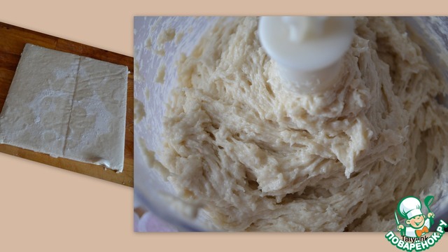 Размораживаем слоеное бездрожжевое тесто в микроволновке на самом щадящем режиме разморозки (или в духовке), чтобы тесто поплыло, разогрелось, но не начало готовиться. Добавляем к нему сахарную пудру и пробиваем в бледере до однородности.