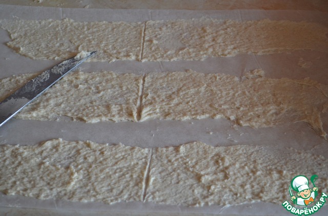 Включаем духовку на максимум. Слоеное тесто с пудрой аккуратно размазываем по бумаге для выпечке-вот такими длинными дорожками. Тонко-тонко. Затем, каждую дорожку аккуратно делим на части ножом. Это дорожки-основа для трубочек.