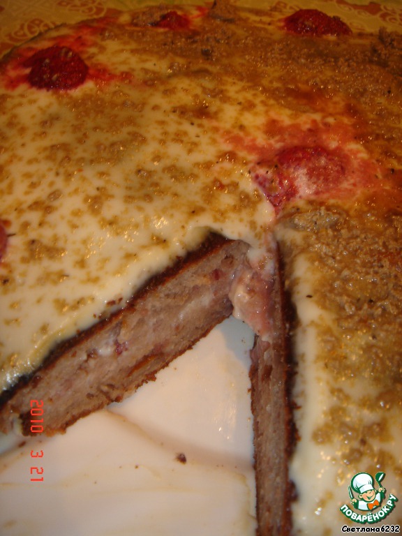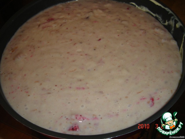 1. Готовое тесто выложить в форму, смазанную маргарином, и выпекать в духовке при 200 градусах 20 мин.