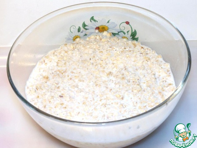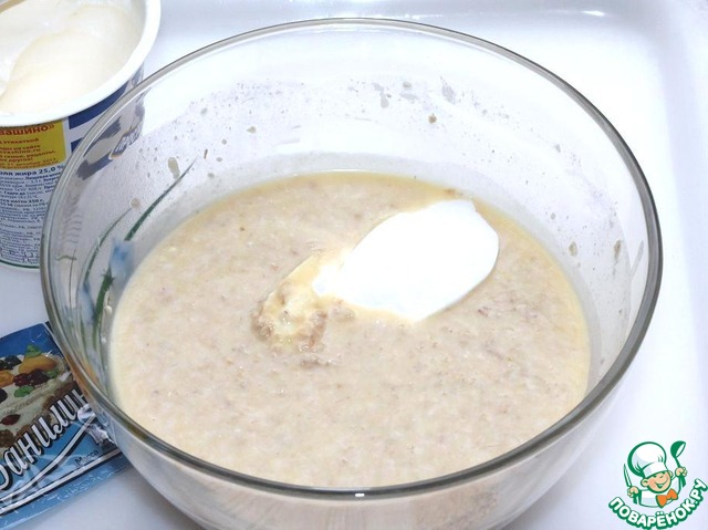 Соединить геркулесовые хлопья с яичной смесью, добавить сметану,