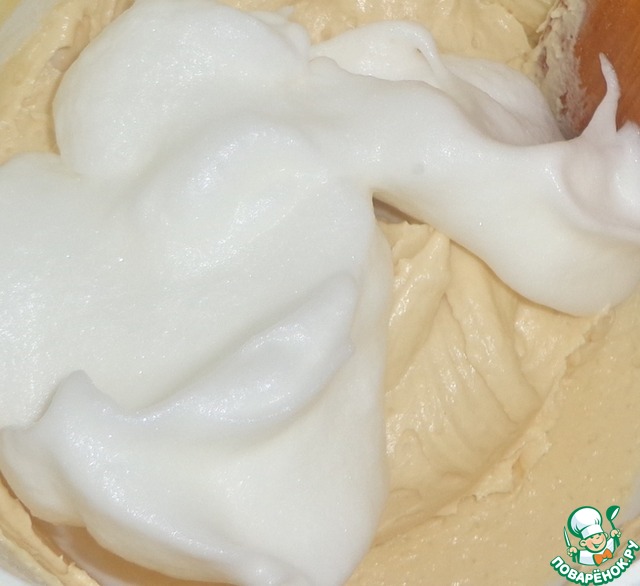 Белок взбиваем в крепкую пену. Взбитый белок добавляем в тесто и перемешиваем.