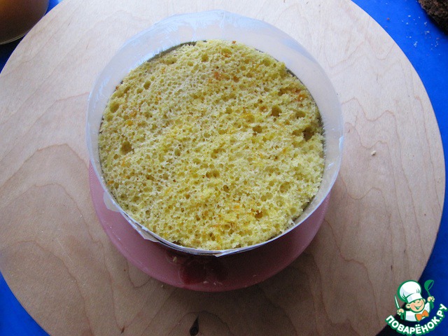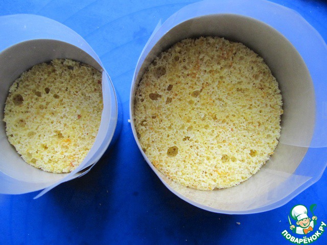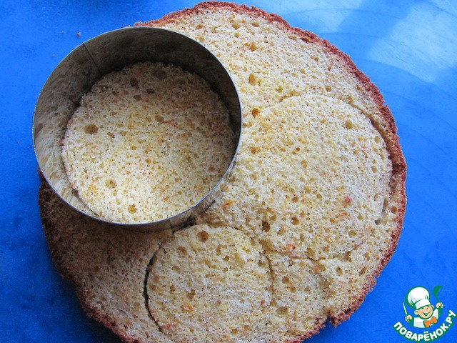 Из приготовленного заранее апельсинового бисквита вырезать формой диски: 2 больших и 2 малых.