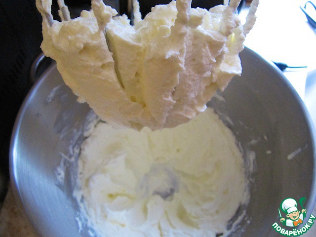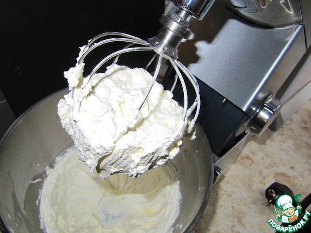 Взбить сливки с сахаром, я для надежности добавила закрепитель (загуститель) для сливок.