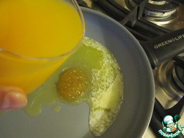 На сковородку выложить сливочное масло, мед и налить пару ложек апельсинового сока. (Можно просто выдавить из целого!).