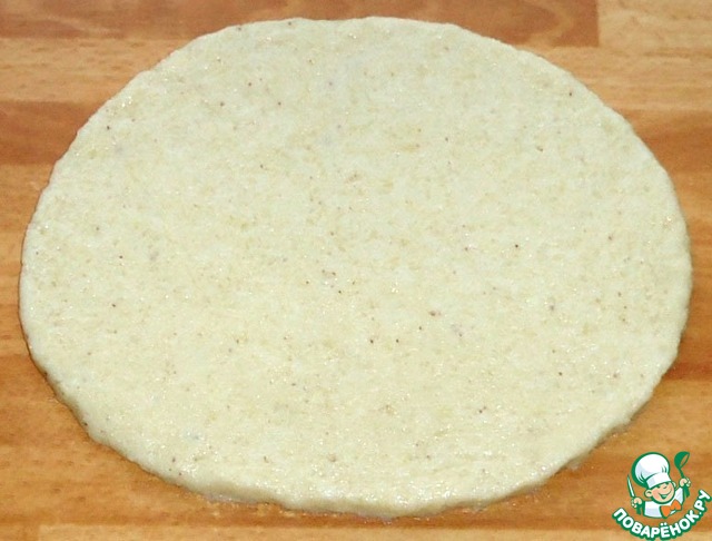 Стол посыпать оставшимся измельчённым миндалём и раскатать тесто в пласт толщиной ~1 см.