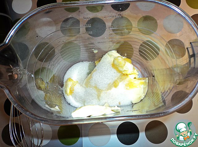 Масло (комнатной температуры!)+ 0,5 стакана сахара, взбить.