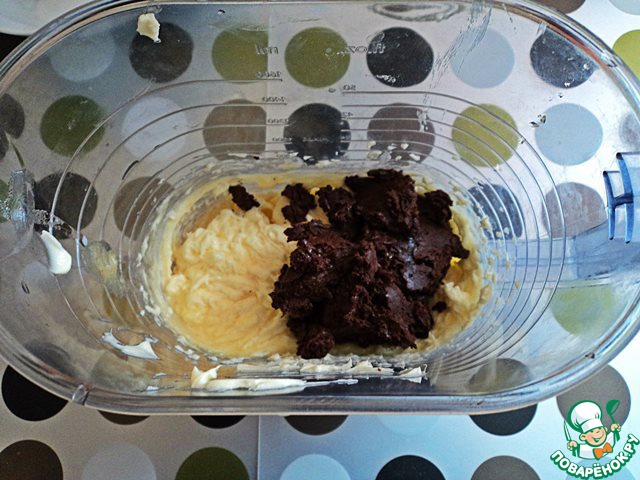 Нам нужно 2 коржа- тесто на жидкой стадии делим пополам и выпекаем или печем 1 большой корж, и разрезаем. Лично я разделила на 2 части и выпекала в своей мультиварочке, на один корж 35-40 мин.