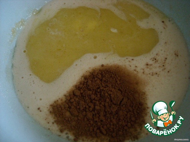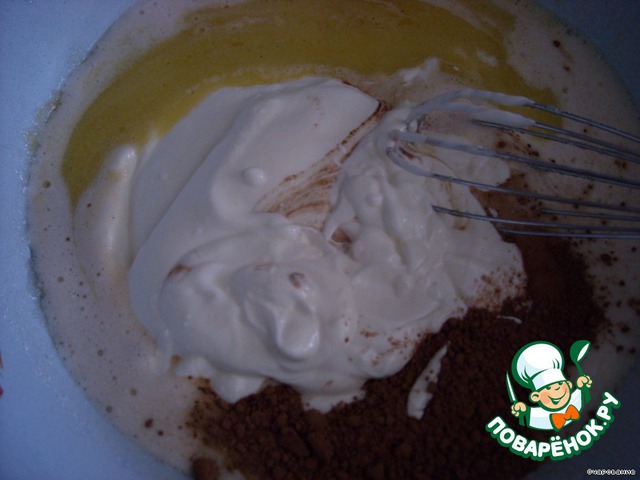 Яйца смешать с сахаром, взбить, добаить какао, растопленное масло, соду, сметану и муку, перемешать и выпечь коржи.