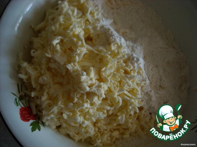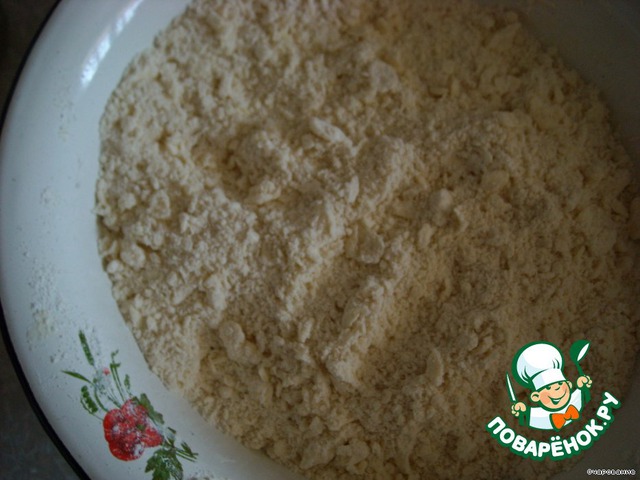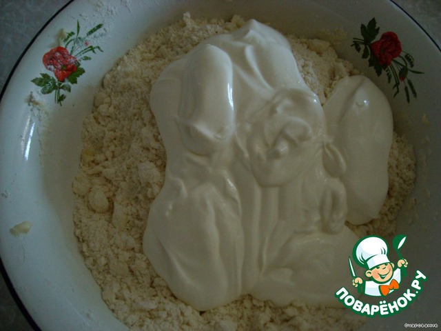 Сначала приготовить песочное тесто. Муку смешать с маслом, превратить в крошку, добавить сметану, соду, замесить тесто, и поставить в холодильник на 30 минут.