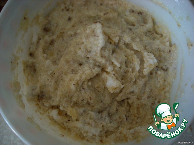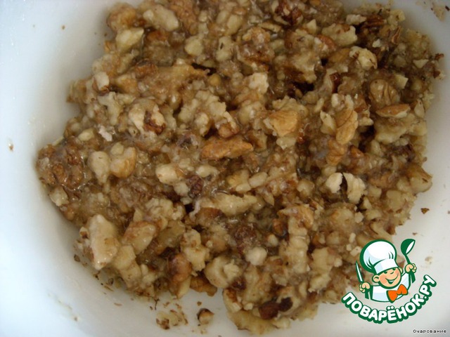И теперь приготовить покрытие для верха. Смешать истолченные орехи с медом и ввести взбитые белки.