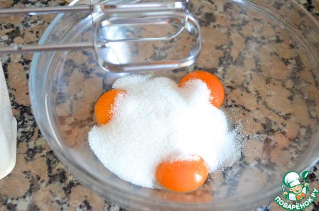 4. Яйца взбить с сахаром, чтобы получилась светлая легкая масса.