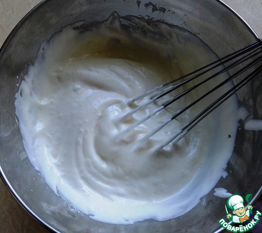 В яичную смесь введите просеянную муку и разрыхлитель, смешайте.