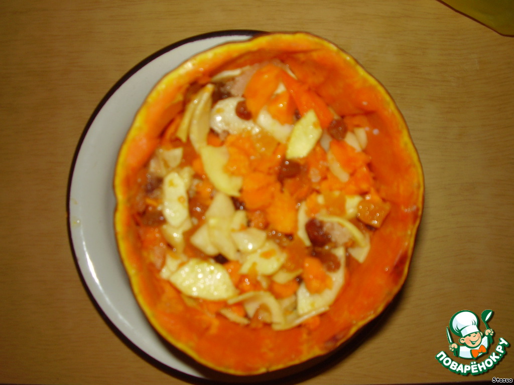 Берем тыкву, срезаем верхушку ("крышечку") и вычищаем ложкой всю внутренность, чтобы стенки тыквы оставались не более 1 см.