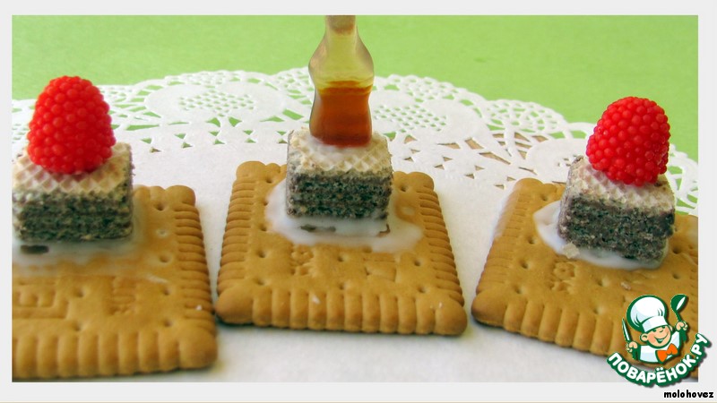 Сначала с помощью глазури приклеим стол и на него поставим угощенье.