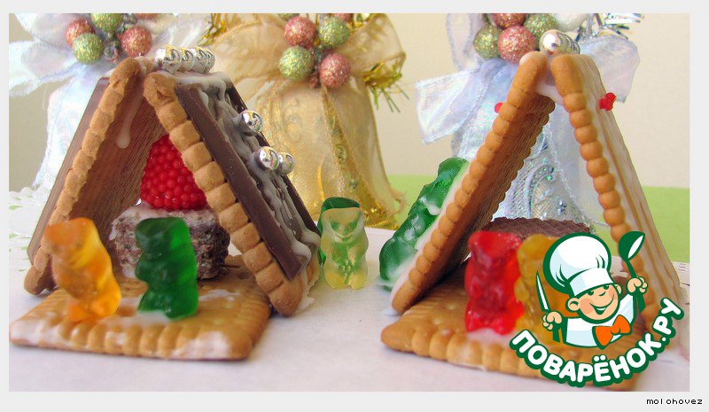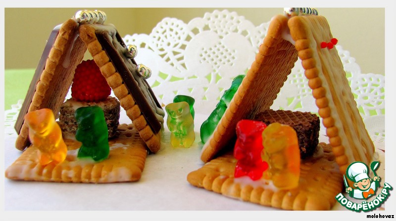 Затем позаботимся о крыше! Склеим печенье между собой глазурью и украсим его! Пора приглашать медвежат на новоселье!