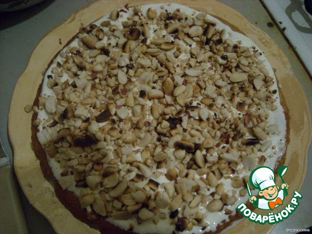 | Тортик простой, не охото было возиться, а к чаю не было ничего. Медовые коржи, промазаны сметанкой, посыпаны орешками и украшено все это виноградиком, мармеладиком. |