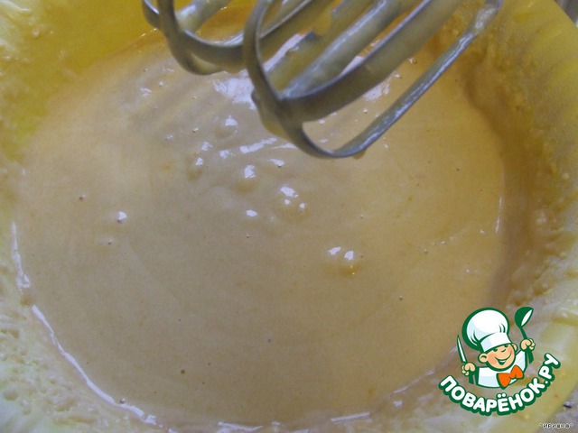 В глубокую миску разбиваем два яйца добавляем 1 стака сахара, 1 стакан кефира, 1 стакан облепихового сока все хорошо взбиваем миксером. В самом конце добавляем 2 стакана муки и соду. Все хорошо взбиваем миксером.