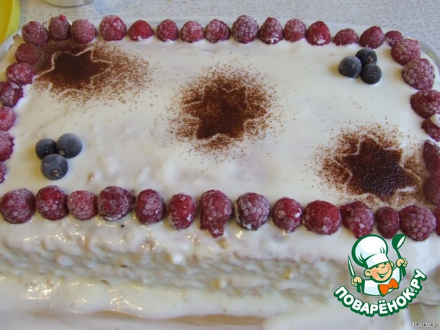 Сверху кладем второй корж и также смазываем кремом. Тортик украшаем ягодами. Вот и все.