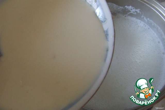 Эту смесь постепенно нужно влить что бы не было комочков в кастрюлю с кипящим молоком, непрерывно помешивая.