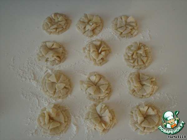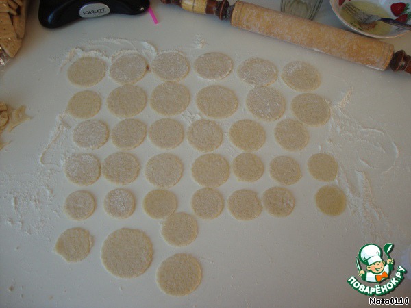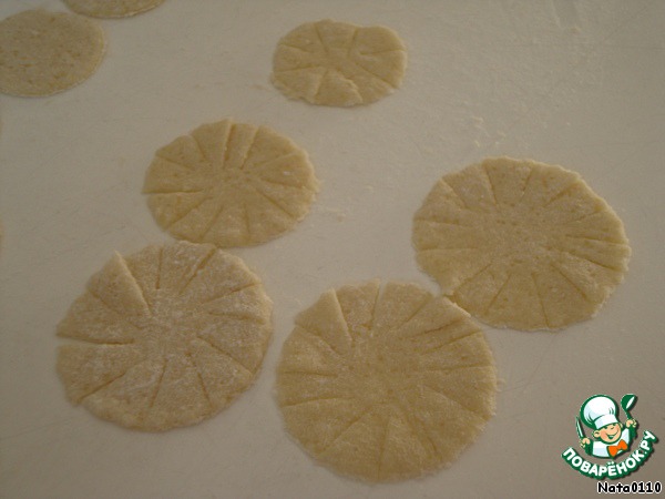 С помощью 3 формочек разного диаметра, вырезать равное количество кружочков.