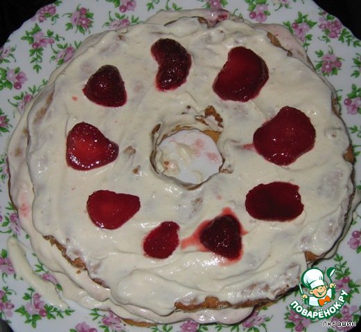 Берем блюдо, на котором будет стоять наша принцесса, кладем на него самый большой корж и смазываем кремом, выкладываем клубничку и еще раз смазываем. И так повторяем снова и снова.