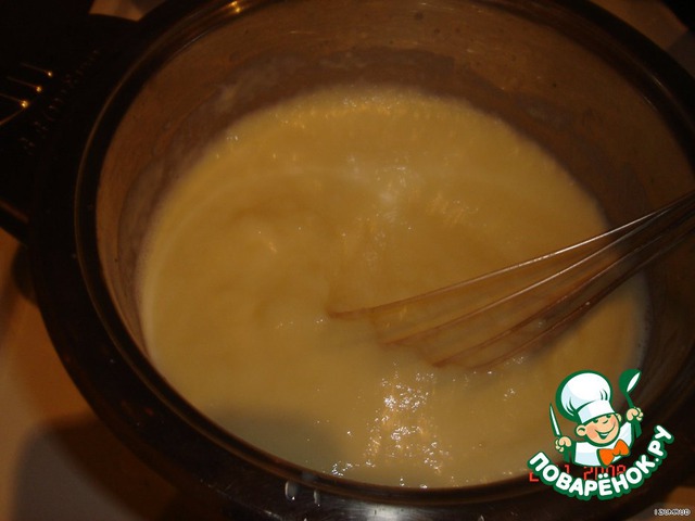 Все фрукты нарезать мелко и перемешать, вскипятить 400 мл. молока с 200 гр. сахара; отдельно приготовить смесь из 100 мл. молока+2 яиц+50 гр. крахмала+оставшаяся мука 50 гр.