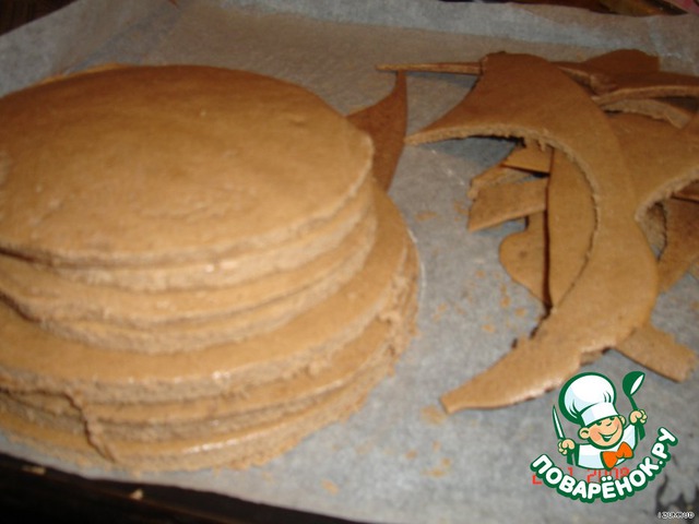 Из коржей вырезать круги разного диаметра (8 штук) круги от большого к меньшему.