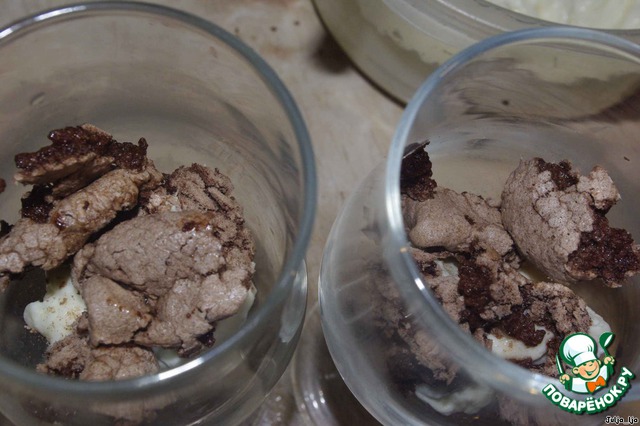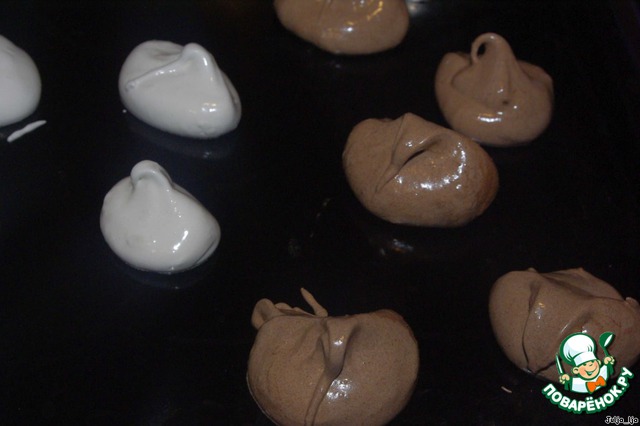 Выкладываем на противень уже шоколадные меренги. Выпекаем при 150 градусах. У меня минут 30 пеклись. Нужно чтобы они были снаружи абсолютно сухие (палец чтобы не прилипал), а внутри немного влажные (при надавливании корочка трескается, а сама меренга как бы пружинит). Вообще их у меня получилось несколько больше, чем нужно для десерта, но я даже не успела этого заметить. :-D