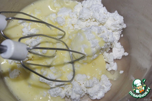 Смешать с творогом остывший желтковый крем, добавив лимонный сок. Взбить миксером на большой скорости, до пышности.