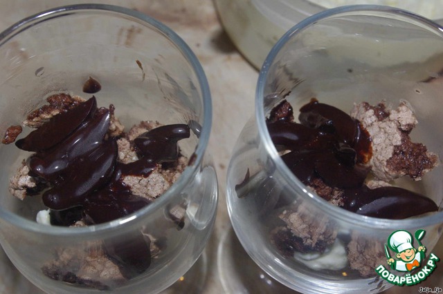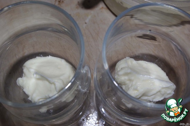 Теперь "собираем" десерт. На дно бокала или креманки, кладём немного творожного крема.