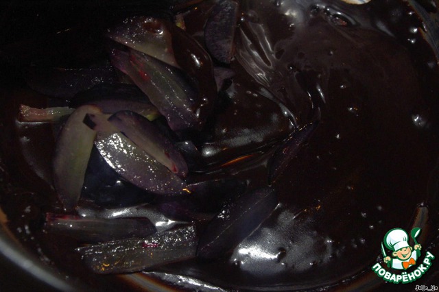 Виноград нарезаем вдоль соломкой. Помещаем в шоколад. Перемешиваем. Получается виноград в шоколаде.