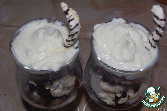 Подаём сразу же. При хранении, меренги размокают и теряют свою "хрустящесть". Тоже вкусно, но не так интересно.. Да. И не пугайтесь, когда десерт начнёт оседать,это нормально.. Просто при выкладывании старайтесь, чтобы было меньше пустот и тогда осядет не сильно.