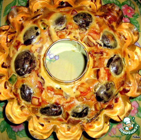 Форму смазать сливочным маслом. На дно налить 2 см теста. Положить слой крупно нарезанных яблок (два ряда)и вылить остальное тесто. Сверху сливы.